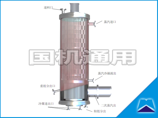 SPE分子蒸餾器一般由帶有夾套的筒體、轉(zhuǎn)子系統(tǒng)和一個內(nèi)部冷凝器組成?;旌衔锪线M入筒體后,經(jīng)過分配器、轉(zhuǎn)子刮板的作用,在筒體內(nèi)壁的加熱表面上形成一層薄膜并以螺 旋路徑向下流動。在此過程中,混合物中的揮發(fā)性組分(輕分子)蒸發(fā),蒸汽通過最短的路徑,接觸內(nèi)部冷凝器冷凝,隨后沿著冷凝器到達設(shè)備底部排出。非揮發(fā)性組分以及 蒸汽冷凝物則沿著筒體內(nèi)壁流下,從筒體側(cè)面的重組分出口排出。殘余蒸汽和惰性氣體通過二次蒸汽出口排向真空系統(tǒng)。 SPE分子蒸餾器特別適用于熱敏感產(chǎn)品的蒸餾、蒸發(fā)、濃縮和汽提,如甘油單酯、維生素、硅油、聚四氫呋喃PTMEG、石蠟、Omega-3脂肪酸、廢油、瀝青等。